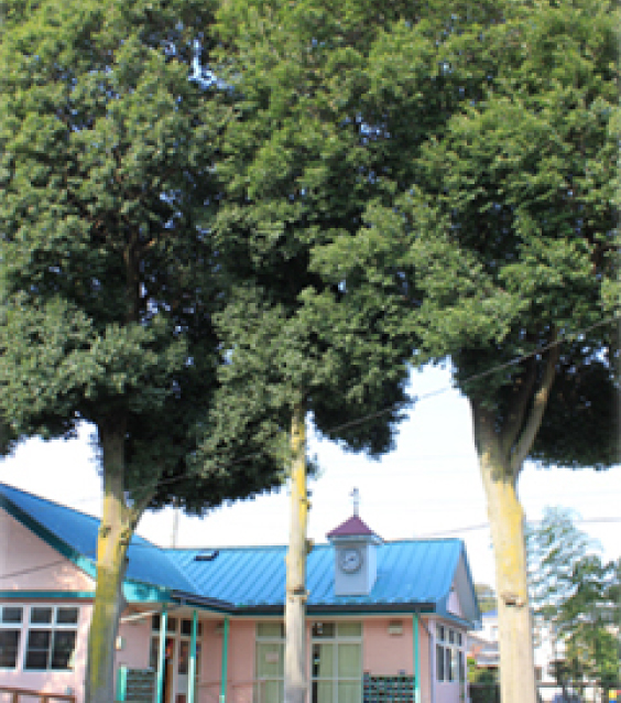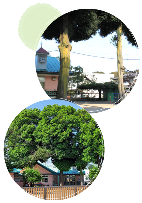 園庭には樹齢70年以上の山桜と白樫が大きく育ち、毎年春秋には花とどんぐりの実で子ども達を喜ばせています。