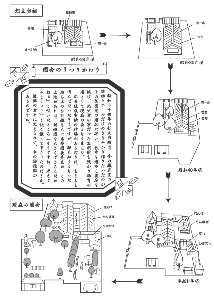 一期生は12人からはじまり、その後園児数の増加に伴い少しづつ園庭を広げ現在の姿になっています。